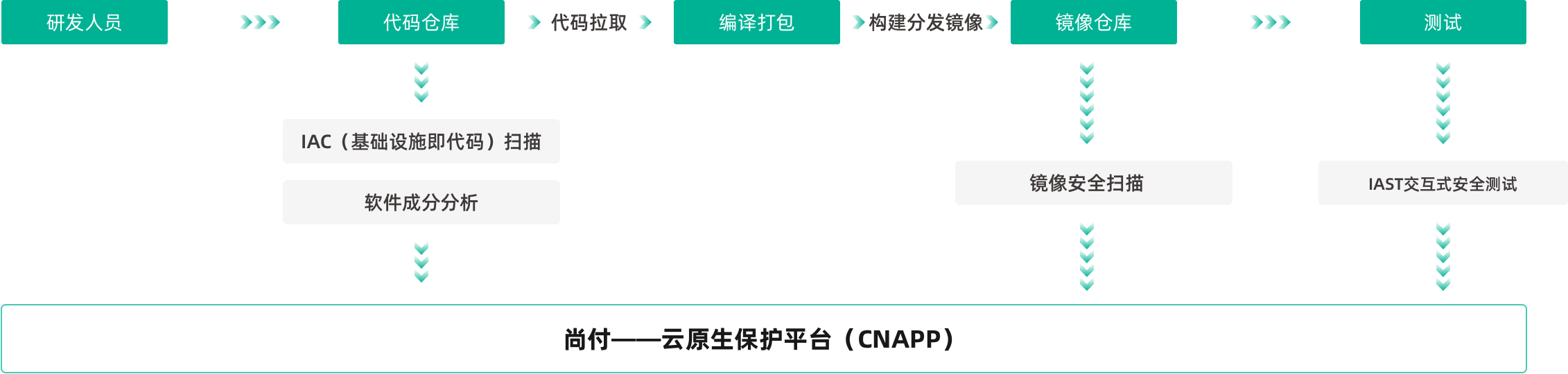 與客戶流水線集成,將安全融入生產(chǎn)流程,通過自動化安全工具鏈,定位開發(fā)過程中各個階段的安全風(fēng)險,卡點處置,實現(xiàn)業(yè)務(wù)上線即安全。